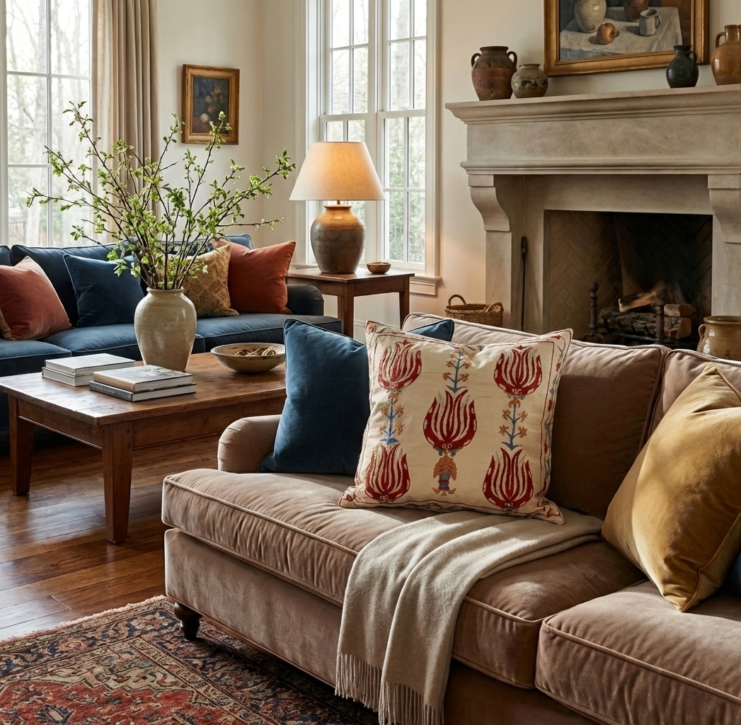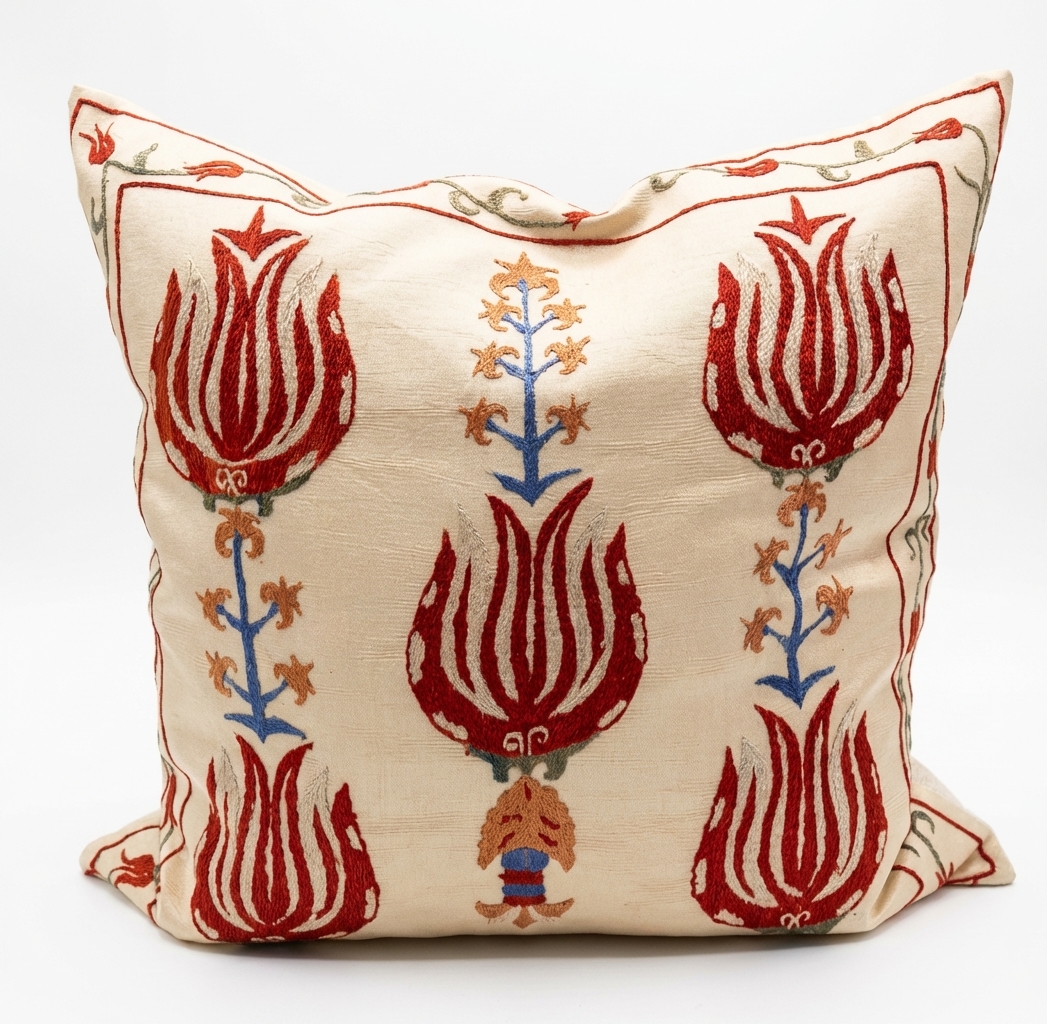 This is not a mass-produced cushion. The bold tulip motif on this suzani cushion draws from centuries of Ottoman and Central Asian textile tradition — embroidered by hand on a cream silk-blend ground in deep red, cobalt, and terracotta. It is the kind of object that becomes the starting point for an entire room. Against a linen sofa, a rattan chair, or a white bed, it introduces colour and craft that no printed fabric can replicate. One cushion. Immediate character.