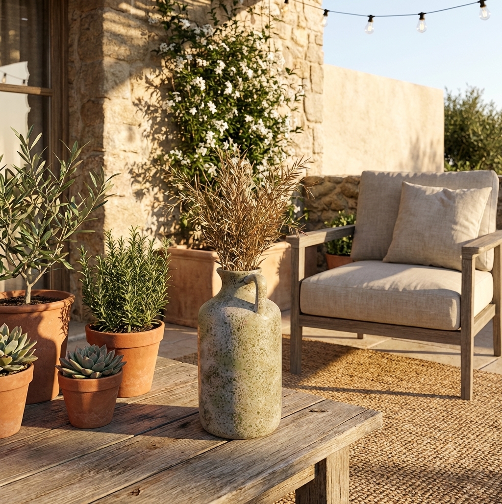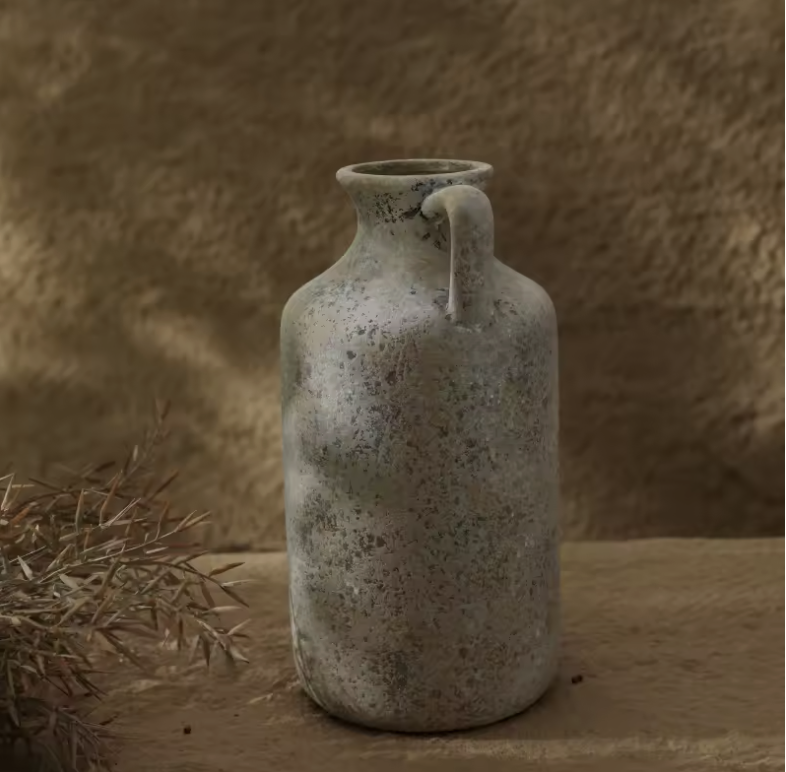 Some objects carry the feeling of another era. This weathered ceramic amphora — with its mottled grey-green patina, small side handle, and gently aged surface — looks like something unearthed from Mediterranean soil. It requires nothing inside it. Alone on a console, a windowsill, or a terrace table, it reads as considered and rare. Pair it with a single dry olive branch or leave it empty. Either way, it earns its place.